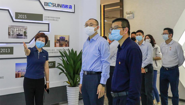 張書記一行來到深圳市百歐森環保科技股份有限公司,調研企業疫情防控和復工復產情況,在百歐森董事長鄔婭玲女士的陪同下,對百歐森的尖端殺菌消毒凈化技術、企業智能化自動生產流程以及全球市場業務模塊和銷售情況進行了解。